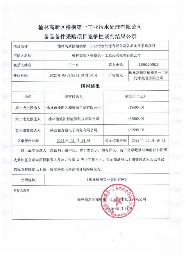 - 榆林高新區(qū)榆橫第一工業(yè)污水處理有限公司 備品備件采購項目競爭性談判結(jié)果公示
