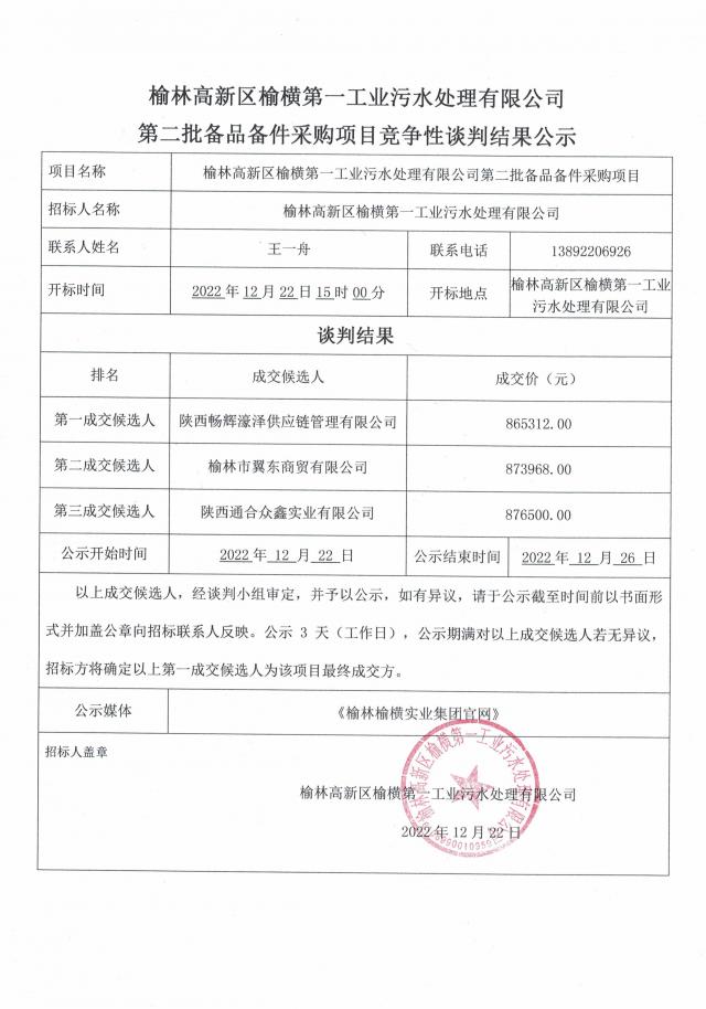 - 榆林高新區(qū)榆橫第一工業(yè)污水處理有限公司第二批備品備件采購項目競爭性談判結果公示
