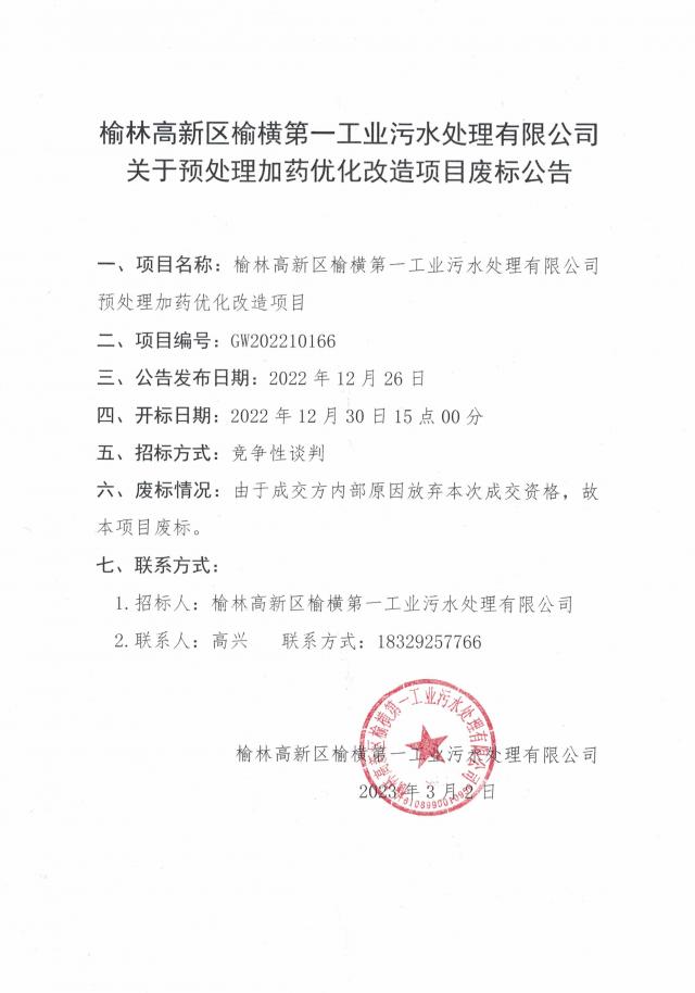 - 榆林高新區(qū)榆橫第一工業(yè)污水處理有限公司關(guān)于預(yù)處理加藥優(yōu)化改造項目廢標公告